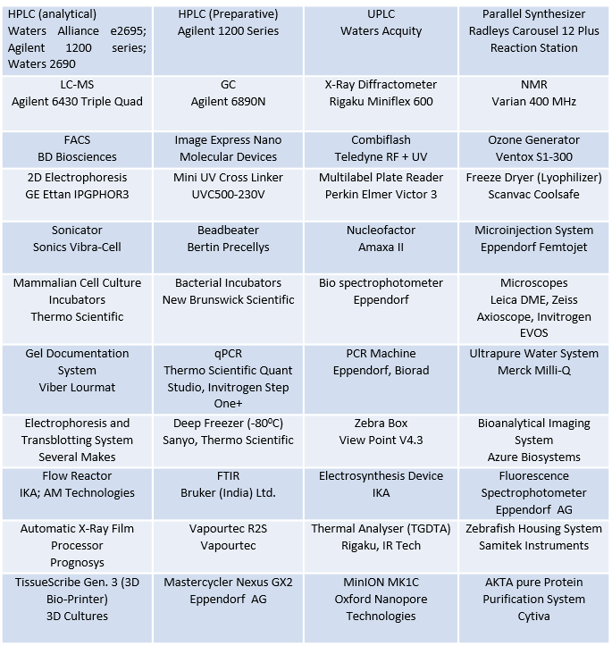 - Centralized facilities includes -800C freezers, high-speed centrifuge, temperature controlled incubator shakers, Nano-pure water filtration system, microplate fluorescence and luminescence readers.